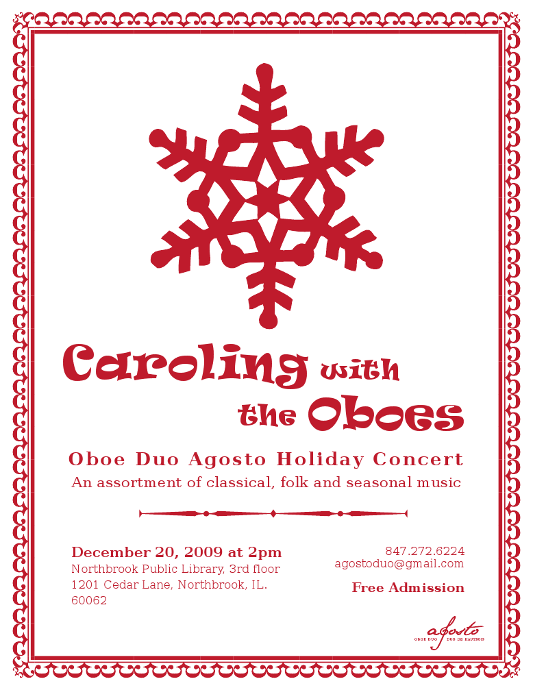 The Oboe Duo Agosto will be performing a Holiday concert at the Northbrook Public Library in Illinois on Dec. 20. Please check the Performance Calendar page for details!