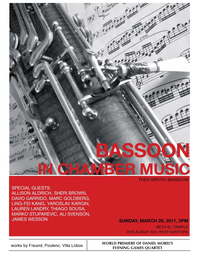 Our good friend and fabulous bassoonist, Thea Groth, will be presenting a chamber recital on Sunday, March 20, 3pm at Beth El Temple in West Hartford. Ling-Fei will be joining her and pianist Marko Stuparevic to perform the Poulenc Trio, one of the most important 20th century pieces written for double-reed instruments. The diverse program also features the bassoon together with flute, clarinet, saxophone, strings and piano. It is definitely a great musical afternoon not to be missed!